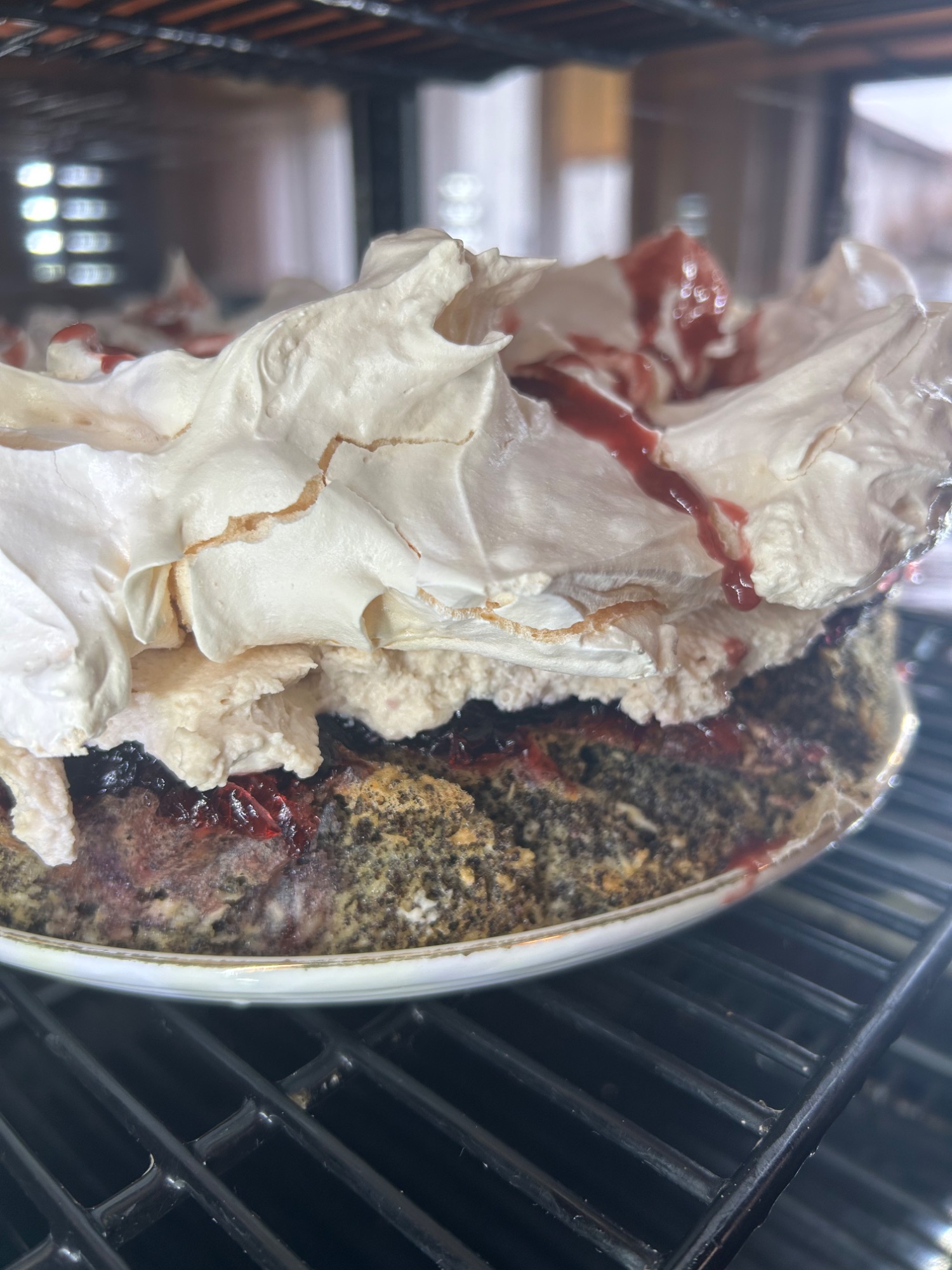 Biszkopt z masą śmietanową ,karmelem i polewą czekoladową z orzechowymi